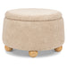 The Tuffet Storage Ottoman combines style and function with its plush upholstery and versatile design. Wooden ball feet add a distinctive touch while providing sturdy support, and the removable lid reveals a spacious interior for convenient storage. Perfect as a footrest, extra seating, or an elegant organizational solution.