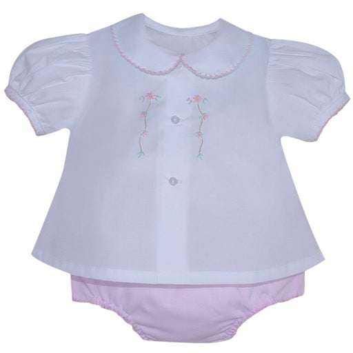 Remember NguyenThis classic white and pink diaper set is accentuated with hand stitched floral detail along the chest. Sweet pink piping along the collar and the...