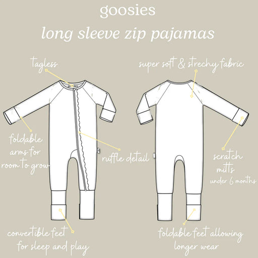GoosiesOur Zip Pajamas feature a two way zipper for easy diaper changes, convertible feet and scratch mitts for sizes 0-3 months and 3-6 months. Extra le...