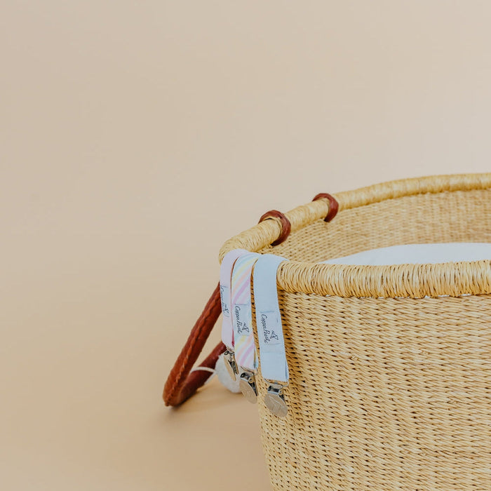 Offering the ultimate blend of fashion and function, our unique Binky Clip features a premium knit strap lined with absorbent fleece to help soak up drool. Simply attach babys pacifier or teether to one end, then fasten the clip to clothing, blankets or baby gear. Oh, and by the way our set includes three Binky Clips to keep with you wherever you go - no more floor drops or pacifier pick-ups!