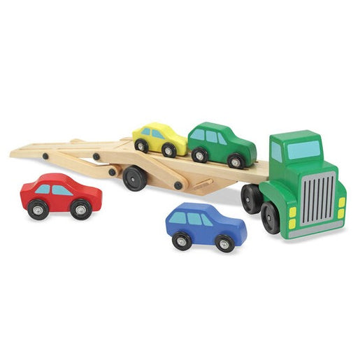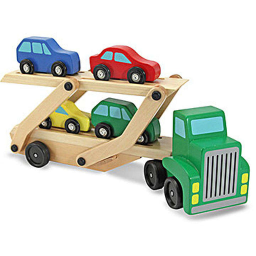 Melissa & DougThis cool truck has a big job: delivering four colorful cars to their new homes! Its upper level lowers to let the cars drive on, then lifts sm...