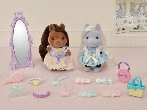 EpochThis sweet "Sylvanian Families" set includes two pony girls with silky hair that you can brush and style, a mirror, hair accessories and fashion ac...
