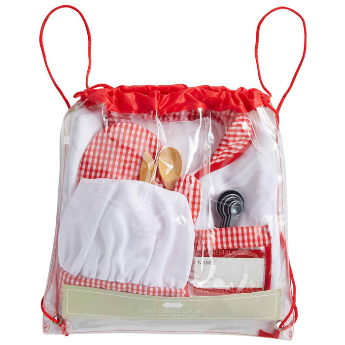 Our kids chef costume is a great gift for your little one. The six piece set includes a chef coat and hat. The hat and coat are both white with red and white checked details. The set also comes with a play knife, spoon, oven mitt, and measuring spoons. The set comes in vinyl drawstring bag, making it easy to gift. This set is one size fits most.