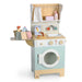 An all encompassing laundry unit where you can wash, dry, iron and fold away all your dolly laundry! Use the pretty wicker basket to collect the dirty laundry, pop it all in the washing machine and add 2 tablets into the top drawer. Press buttons to start/stop, and select a cycle and spin speed on 2 clacking knobs. Select temperature for the drying cycle and watch as the clothes get tumbled about! A sink area to hand wash and a variety of 3 wooden and 2 cardboard cleaning products to assist a bright wash day! Hang the clothes on one of 3 lines with wooden pegs, and finally give it all a good press on the fold up ironing board on the side. Good for pretend play. Good for social and language skills.