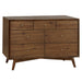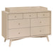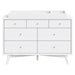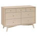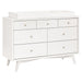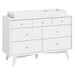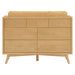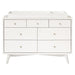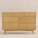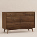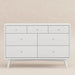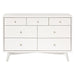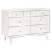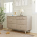 The Palma 7-drawer Double Dresser is a sophisticated mid-century inspired design with contrasting walnut stained drawers, tapered legs, brushed metal hardware, and smooth-glide drawers. It's a versatile modern piece, providing ample storage space with three top drawers and four larger bottom drawers. Pair with the Palma 4-in-1 Crib or Peggy 3-in-1 Crib for an elegant nursery.