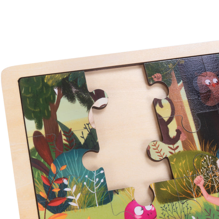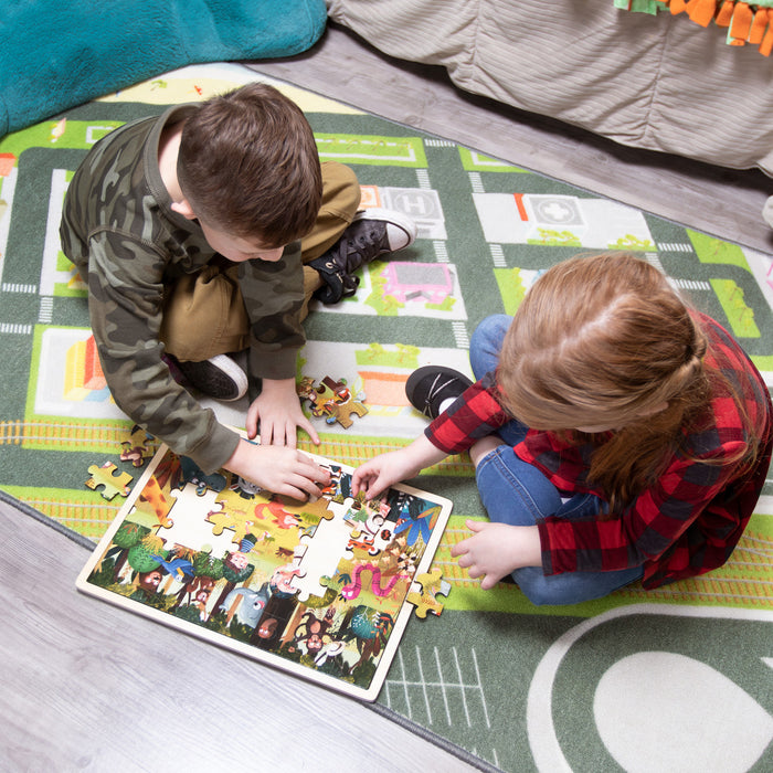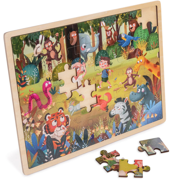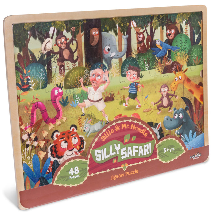 Ollie and Mr. Noodle are ready to explore the great outdoors! Piece together some safari animals, shady trees, and a few mischevious monkeys. Each of the 48 pieces fit in the 15.75" x 12" wooden inset frame, so you can solve this safari anywhere you go!