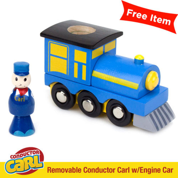 Children can build train sets from scratch and then role play with the various characters. Conductor Carl train sets use single piece construction train track. Many of our competitors use pegs for all of their track as the connecting piece. We use it on only a few select custom pieces, but our standard track pieces are all single pieces. Single piece construction track also results in a snug fit which ensures trains do not hop off the track. Conductor Carl train sets are compatible with other popular wooden railway systems such as Thomas & friends and BRIO. Feel free to mix and match between sets to arrive at grand scale train towns.