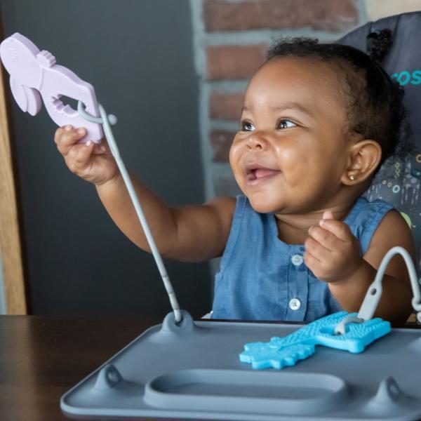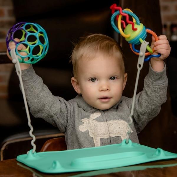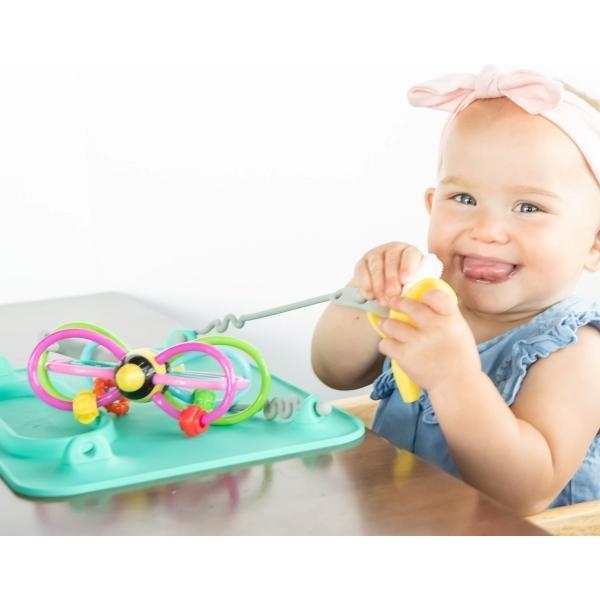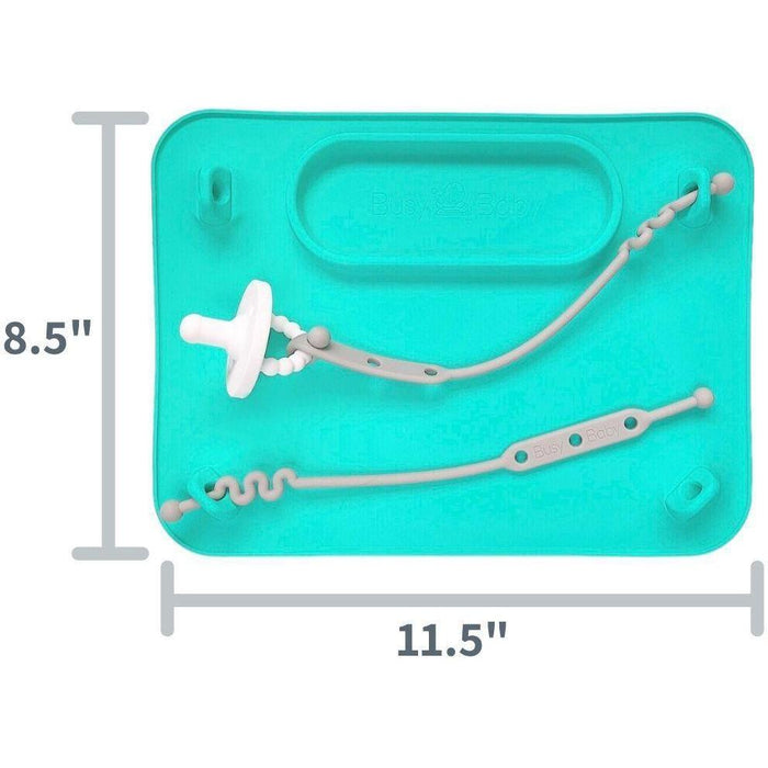 This children’s placemat comes with two or four light grey toy straps to keep toys within your child’s reach and free from germs. No longer do you need to constantly pick up your child’s toys as they can now be safely attached to the Busy Baby Placemat. Using silicone-based ball-and-socket technology, we have created a unique toy strap that is both safe and durable. We also include a lightweight travel sleeve at no additional cost.