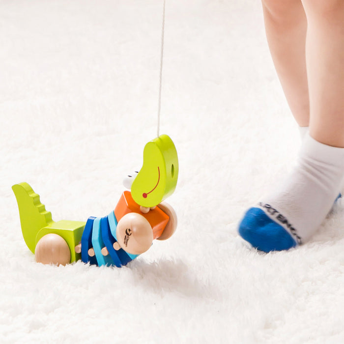 Looking for a new friend for your child? This adorable pull crocodile will be the ideal companion as your toddler takes a long walk around your house! The alligator has a flexible body that will twist or wiggle when pulling it. The body of the crocodile makes “click-clack” sound which will add more fun when your children play with it. This pull crocodile encourages imitative and imaginary play, and stimulates early walking skills.