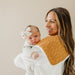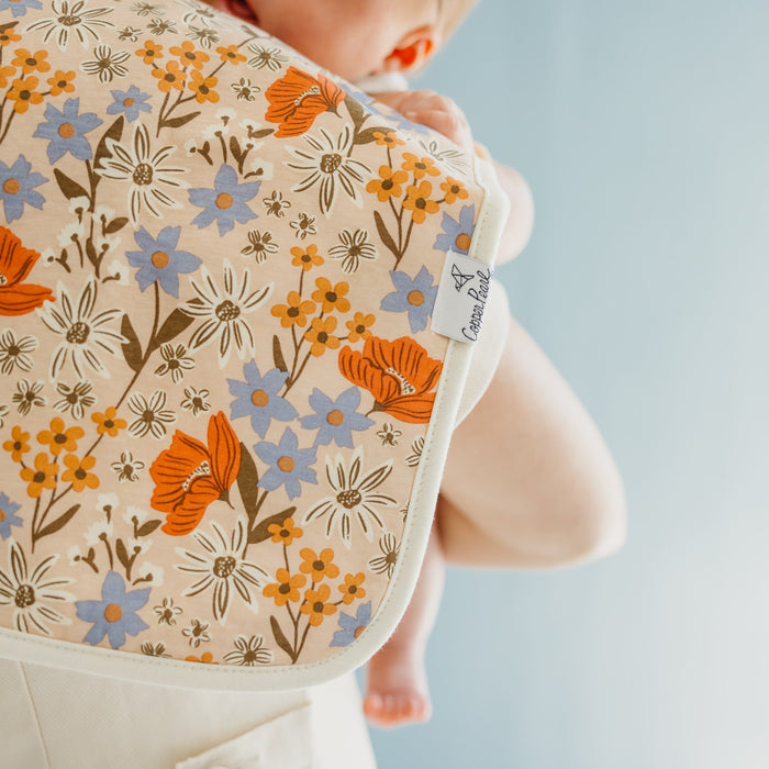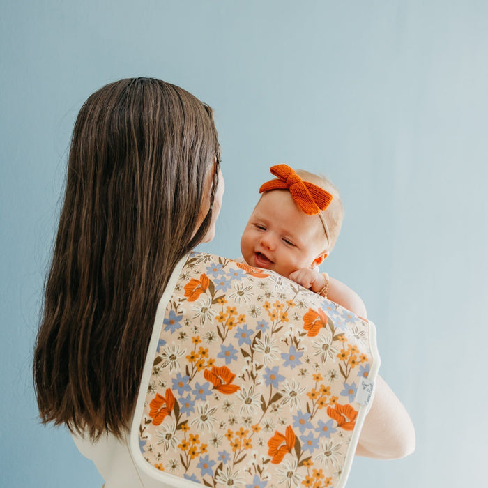 These stylish drool bibs are made of 100% absorbent cotton on the front and 100% polyester fleece on the back. The front of the baby bib is a stylish knit fabric and the back is a super soft fleece that keeps your baby completely dry even with the drooliest of babies. Great for teething babies!