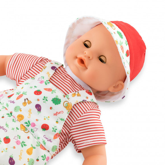 The doll's head and limbs are made of soft vinyl that is lightly scented with vanilla, a Corolle signature. Its soft body allows it to take on the same positions as a real baby, she can even suck her thumb, also like a real baby.
