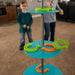 Players take turns tossing the rubbery horseshoes to try and ring them onto the suspended pole and platforms.
