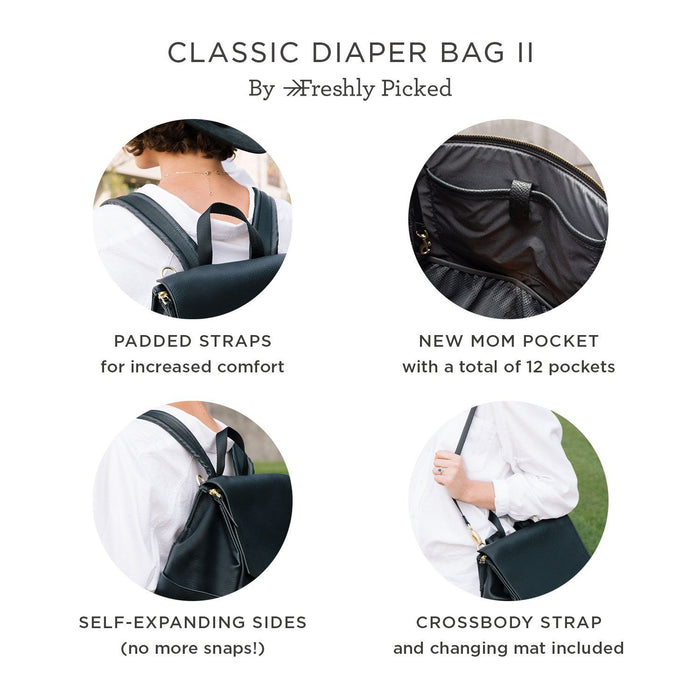 We took your favorite diaper bag and improved it! The Diaper Bag by Freshly Picked was designed for moms by moms. We conducted focus groups across the US and identified what moms really want in a diaper bag: large capacity, ease of use, durability, and style. We’ve addressed each of these areas to create the perfect diaper bag that is both functional and beautiful. It now has padded shoulder straps, a mom compartment, and mesh interior pockets!