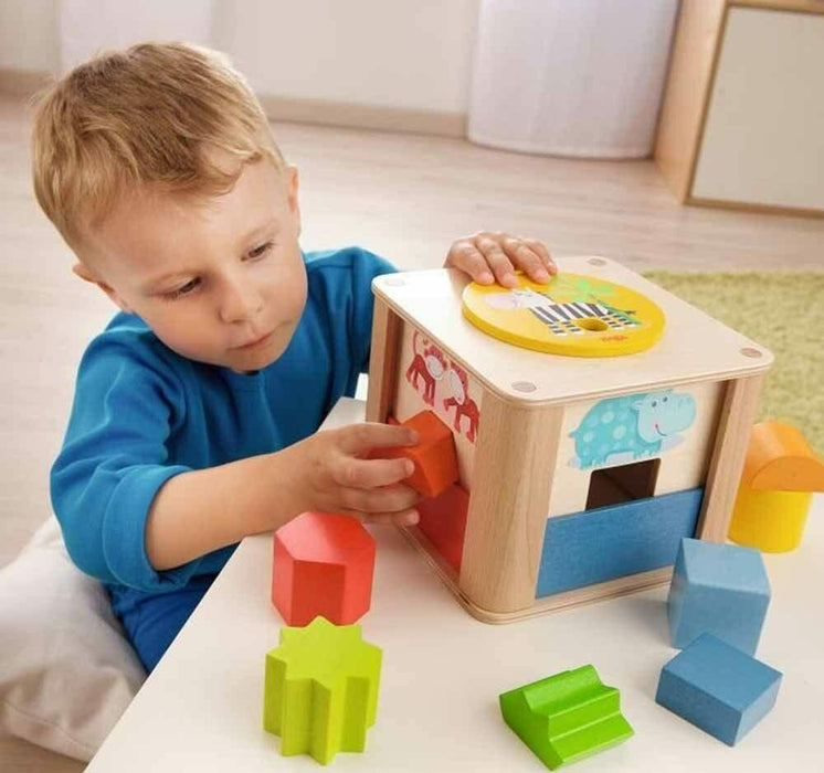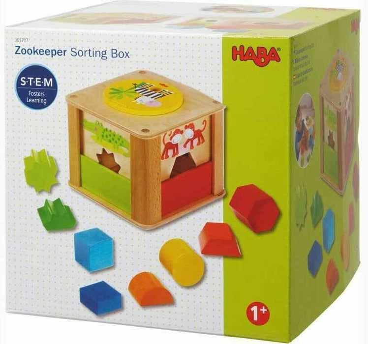 With this sorting box, children have twice as much fun! Just like in a real zoo, within every vivarium there is a slide: If pushed down, only the half wood shapes fit through the opening. If pushed upward, the opening is large enough for the whole wood shape. This is fun because as children play, they can pretend to feed the animals while becoming more familiar with color and shape recognition. Includes 8 wooden shapes and 1 sorting box.