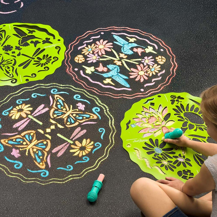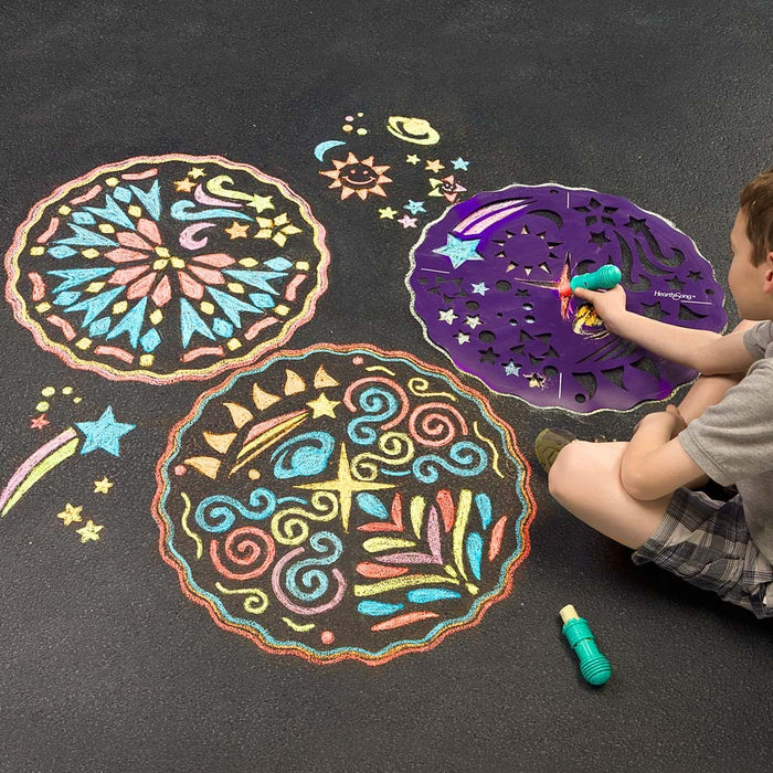 Invite outdoor, creative fun for young artists with Chalkscapes® Mandalas Sidewalk Stencils Chalk Art Kit! This award-winning set of two easy-to-use, artistically adaptable stencils and cosmically colored chalks allows creative kids to turn sidewalks and driveways into colorful art exhibits (bonus—use indoors on our Roll-Up Chalk Mat, 732991, sold separately). Trace the stencil as a unit, mark it into mix-and-match quadrants, or use the fun motifs separately—the options are limitless.