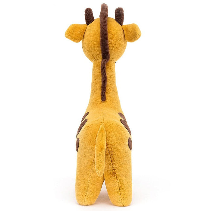 Big Spottie Giraffe is a cheery-bright chum in gorgeous custard-chocolate fur! This cuddly calf may have diddy legs, but look at that funky long neck! With a punky mane, scrumptious freckles, soft wee horns and a cocoa muzzle, not to mention those tickly leafy ears, our jolly giraffe brings so much joy.