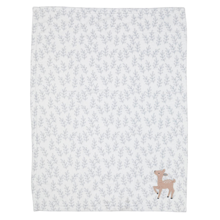 Cuddle your little one in this soft Deer Park blanket. Willow, a charming tan deer is appliqued in a soft minky fabric and has embroidered white spots along with an embroidered face. The blanket is a white ground with printed gray leaves. It is a soft polyester coral fleece and is 30” X 40”. It makes a great stroller blanket and a great all around go anywhere blanket.