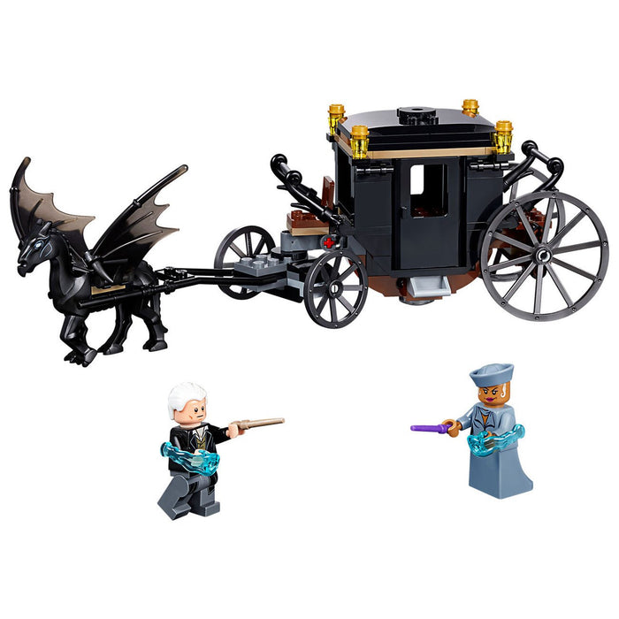 Enter a fantasy realm with LEGO® Fantastic Beasts™ 75951 Grindelwald’s Escape magical showdown between Seraphina Picquery™ and Grindelwald, featuring an articulated carriage with opening doors and removable roof attached to the Thestral figure with hinged wings. Use the shooting spell accessories to make the Fantastic Beasts: The Crimes of Grindelwald magic come alive and role-play a mighty battle. Includes 2 minifigures.