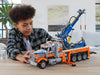 This tow truck toy with crane is filled with impressive features. Open the hood to see the 6-cylinder inline engine with moving pistons. Steer by rotating the pin on the roof. Activate the crane, pump up the boom, pull out the winch and extend the outriggers. And for the first time in LEGO Technic history, this vehicle has a lifting axle to pull down extra wheels and spread the weight of loads.
