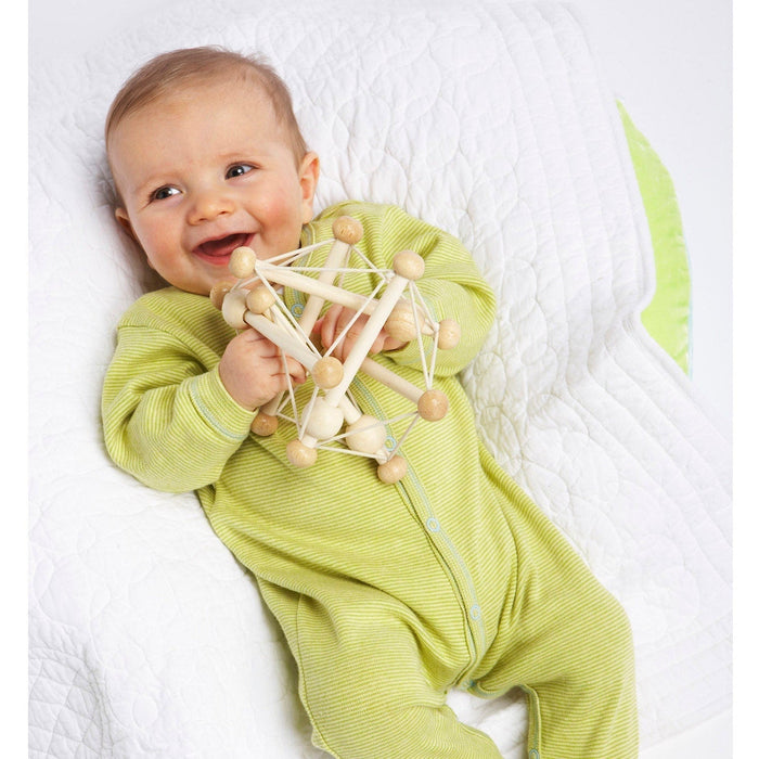 Our Classic Skwish goes natural. The award winning Skwish fascinates babies with springy, rebounding elastic strung between sustainable rubberwood teether rods. Skwishes and returns to its original shape, with beads that slide and rattle. This multi-sensory activity provides unlimited infant entertainment. It introduces the concept of cause and effect while boosting the development of important gross motor skills such as grasping and reaching.