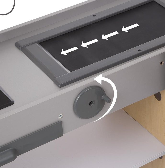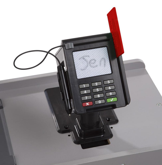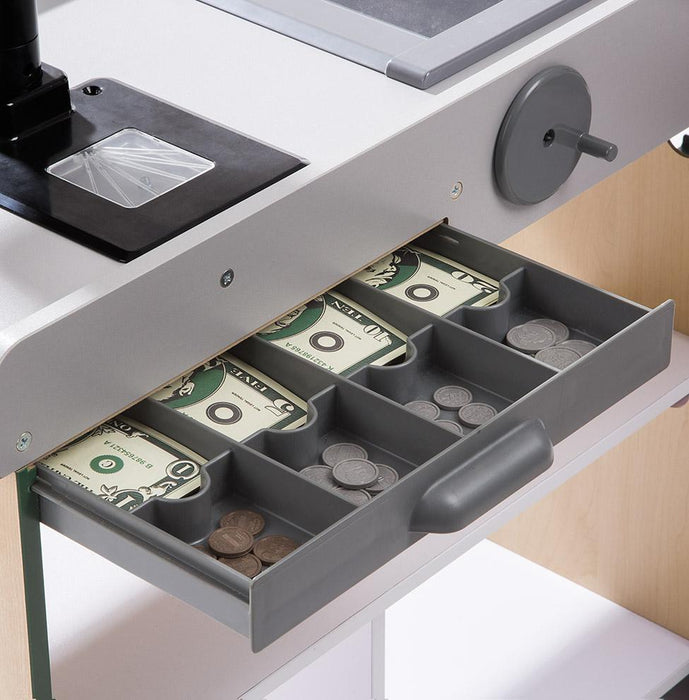- Includes hand-cranked conveyor belt, beeping "scanner," bagging area, card swipe machine, and cash drawer