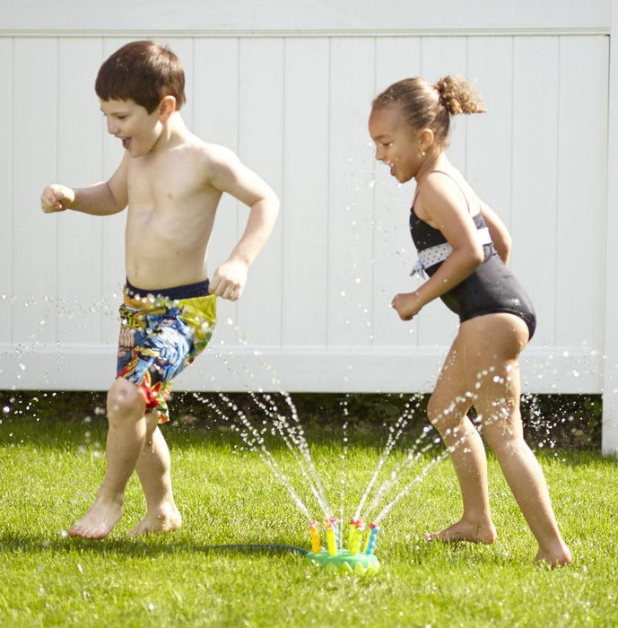The Splash Patrol's motto is all for one and fun for all! They always work together--especially when they are squirting you with water! This whimsical outdoor sprinkler is made from durable materials. It attaches easily to a hose for outdoor fun for the whole family, as well an adorable way to water the garden. The sprinkler encourages outdoor active play and helps develop coordination.