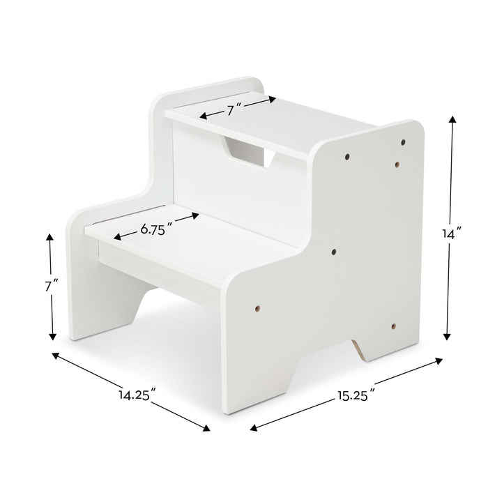 Give kids a leg up with this sturdy wooden two-step step stool! Available in natural, white, and espresso finish to fit with any home décor, this stool is great for helping kids up to 100 pounds reach books and toys in the playroom, climb into bed at night, brush their teeth and wash their hands at the bathroom sink, or help out in the kitchen at mealtimes! Easy to assemble with a Philips head screwdriver, not included. Maximum load 100 lbs.