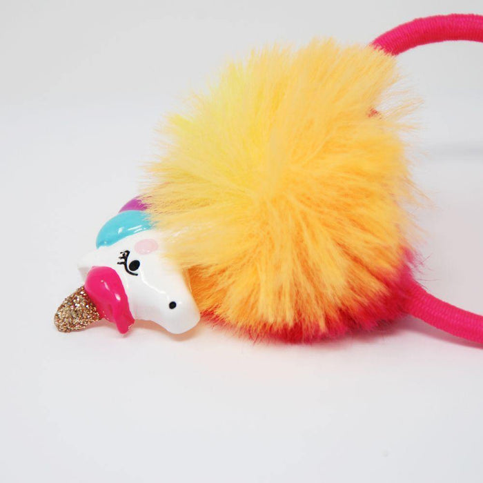 Pom pom hair elastic with unicorn pom pom decoration with thick elastic band, . Yellow and pink fluffy pom pom decorated with a multi colored unicorn face, . One size fits all. Care: Wipe with damp cloth.