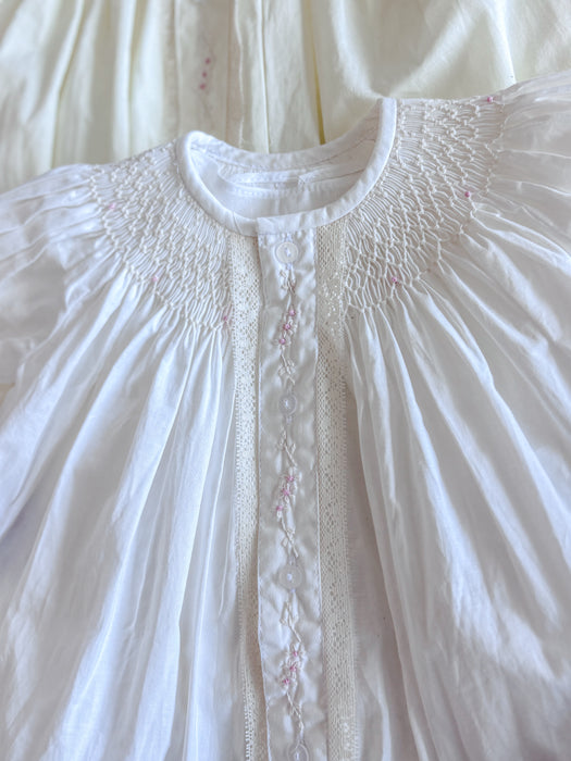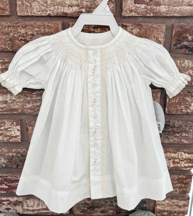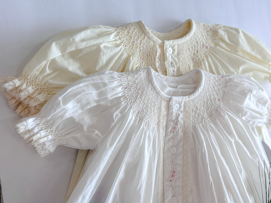 The Annalee’'s traditional appeal is accentuated with classic hand embroidered smocking along the collar and floral detail along the front button panel. Vintage lace adorns the center of bodice and sleeve. It is a classic look for portraits or any occasion. Pair with matching bubble for a sibling set, or coordinate with the Annalee dress or bubble in a different color.