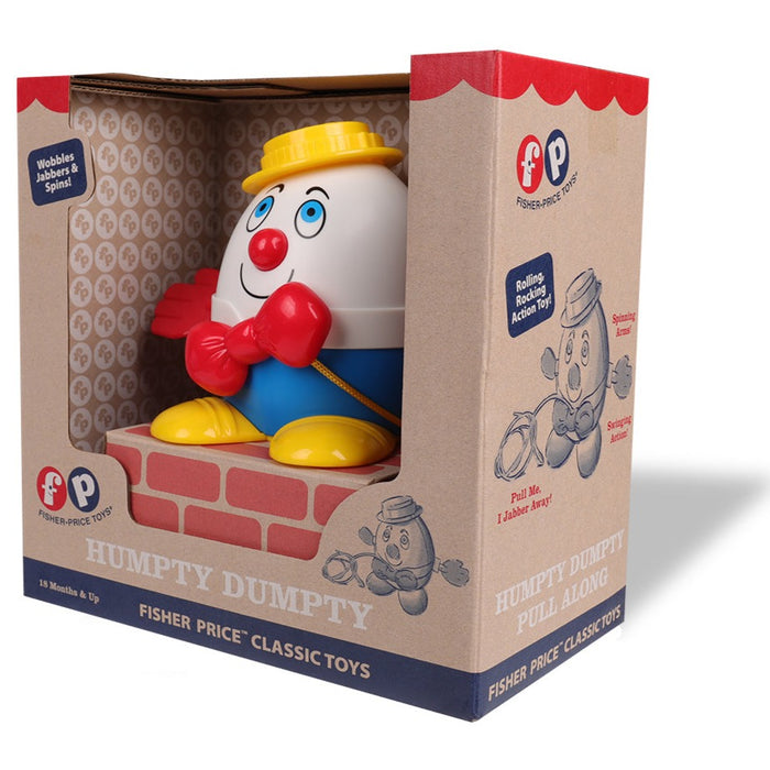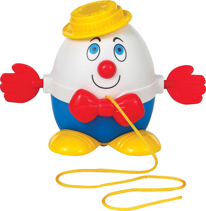 First introduced in 1972, Humpty Dumpty brings to life the nursery rhyme character kids have loved for years. When you take Humpty for a spin by pulling his string, he gets into the action by moving his bow tie and arms. Pull him some more to hear jabbering sounds. A tried and true Fisher Price Classics toy reissued to be enjoyed by today’s kids.