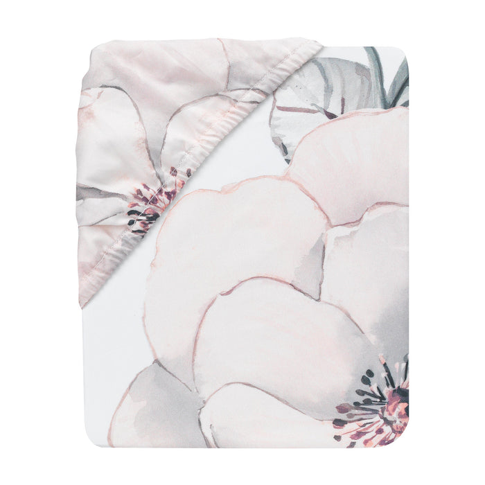 This exquisite 100% cotton fitted crib sheet has a white ground with blossoming pink and gray watercolor flowers. It is breathable cotton and has elastic all the way around ensuring a safe and secure fit on a standard sized crib mattress measuring 52” X 28”.