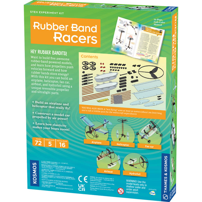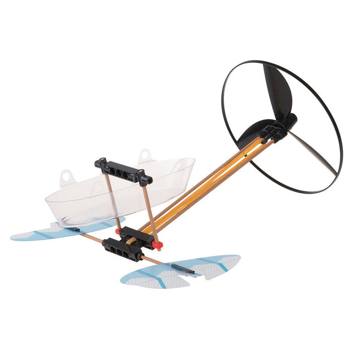 Fly into physics fun with five awesome models driven by a rubber band powered propeller. Using ultralight plastic and bamboo parts, build a helicopter, airboat, airplane, fan car, and hydrofoil. Learn how the elastic material stores energy and then releases it to move the models.